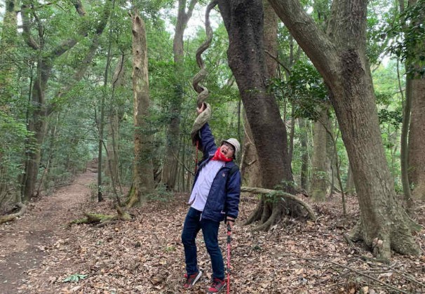 またまたインスタスポット。巻いたツルの木があったので引っ張られる演出。実際は手を突っ込んだだけです。(10:30)