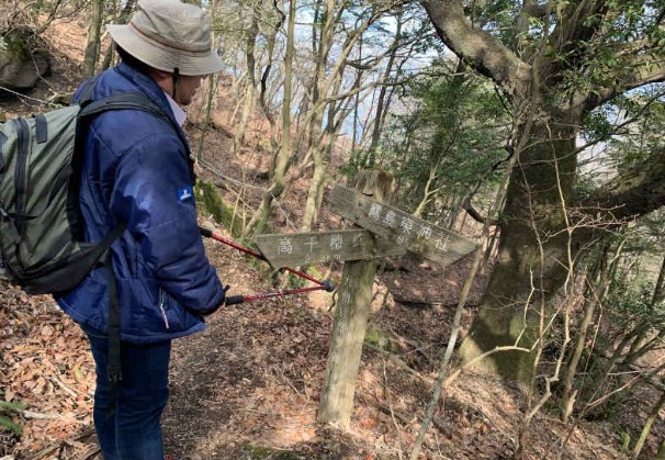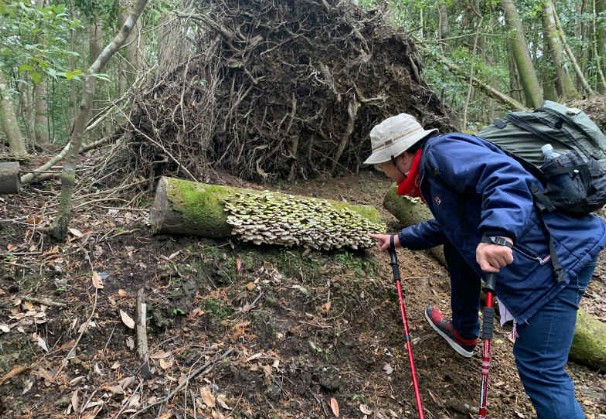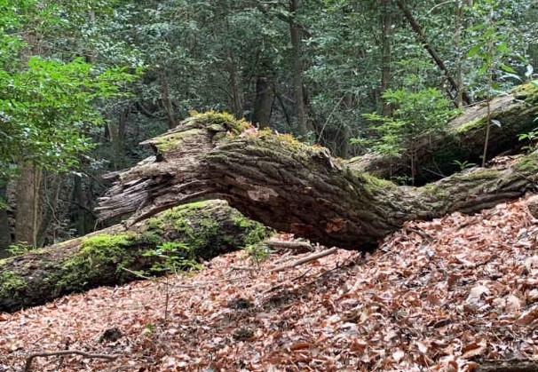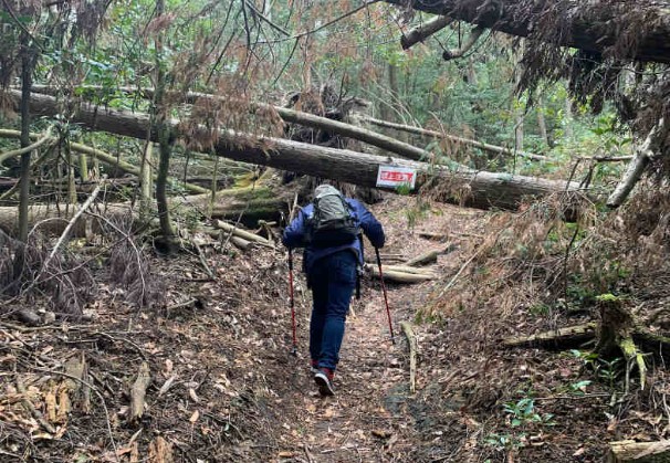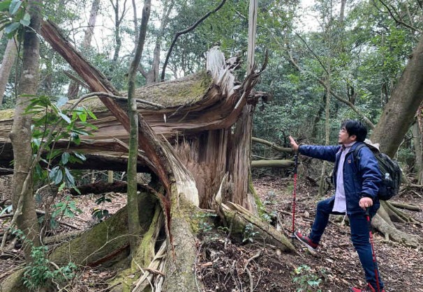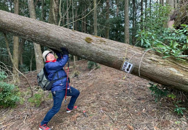 登り始めて数分経つと、いきなりインスタ映えスポットが!台風か何かで倒れた杉の木だと思いますが、さっそくおっさんがお茶目なことして写真撮ってます。(この時は元気でした、、)
