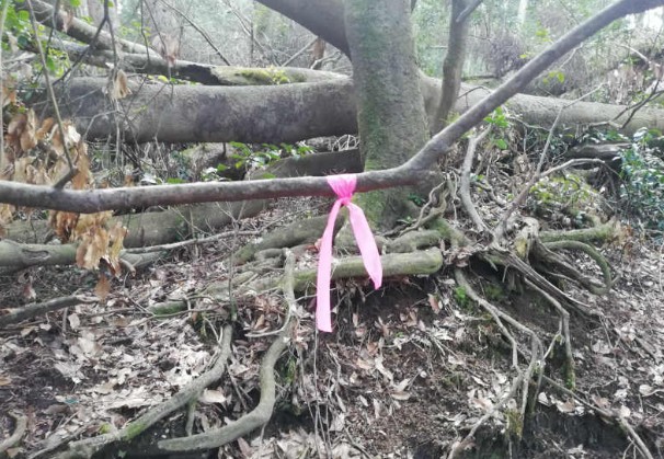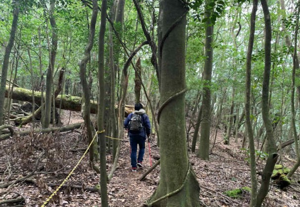 森の中をさまよってる感じになるので(もちろん上を目指しますが)ところどころにあるロープと、ピンクのテープが道しるべです。(11:30)