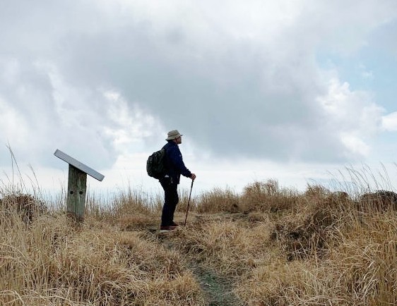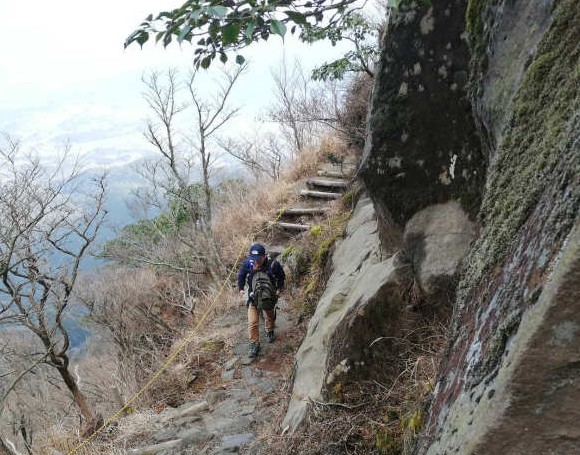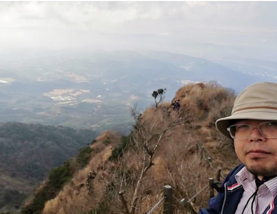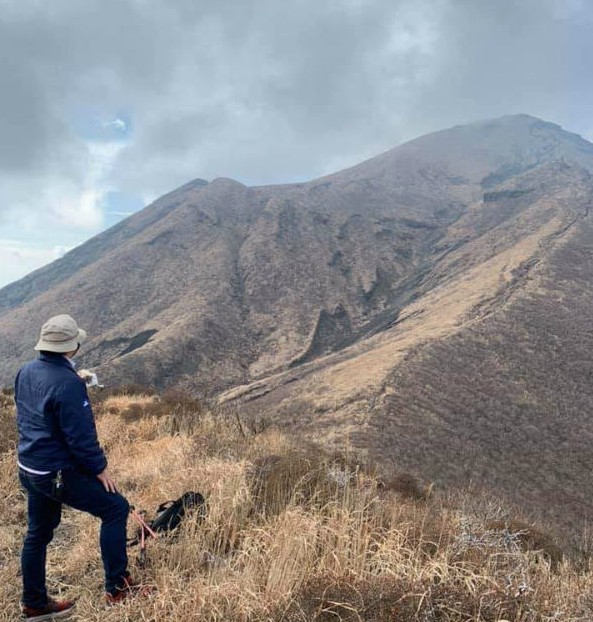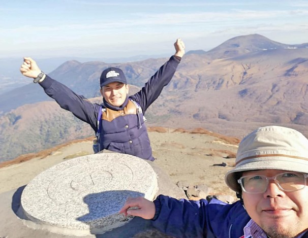 南は桜島(鹿児島)、東は太平洋(宮崎)(天気が良ければ)まで見渡せる特別な場所です。と妄想にふけっていると。サポーターの貴嶋君が「そろそろ下りますよ」って。え?もう?「登りに思ったより時間がかかったので、早めに下ります」との決断。もう少しゆっくりしたかったけどすでに14時30分。超重い腰を上げて下山に進みました。