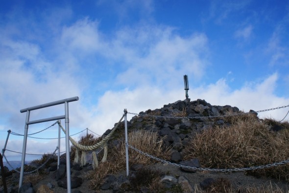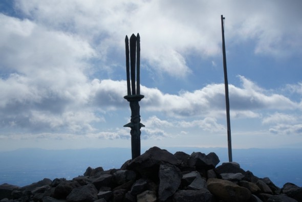 高千穂峰登山の最終目的地、標高1,574 mの天逆鉾のある頂上が見えてきた