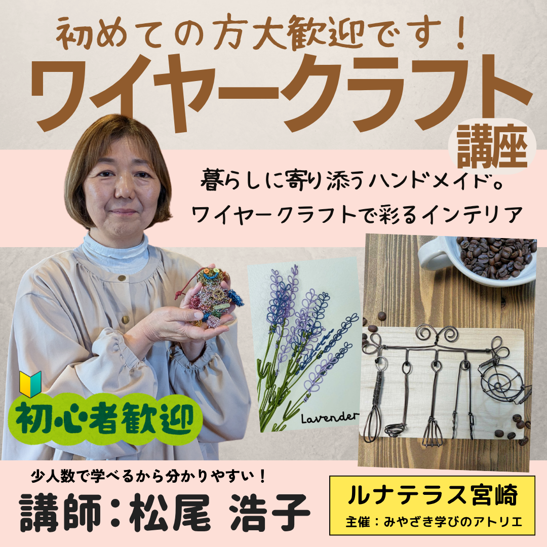 宮崎市の「みやざき学びのアトリエ(ルナテラス)」では、当講座以外にも、様々なスキルアップセミナーを予定しています。「みやざき学びのアトリエ講座」の案内も、是非ご覧ください。↓↓