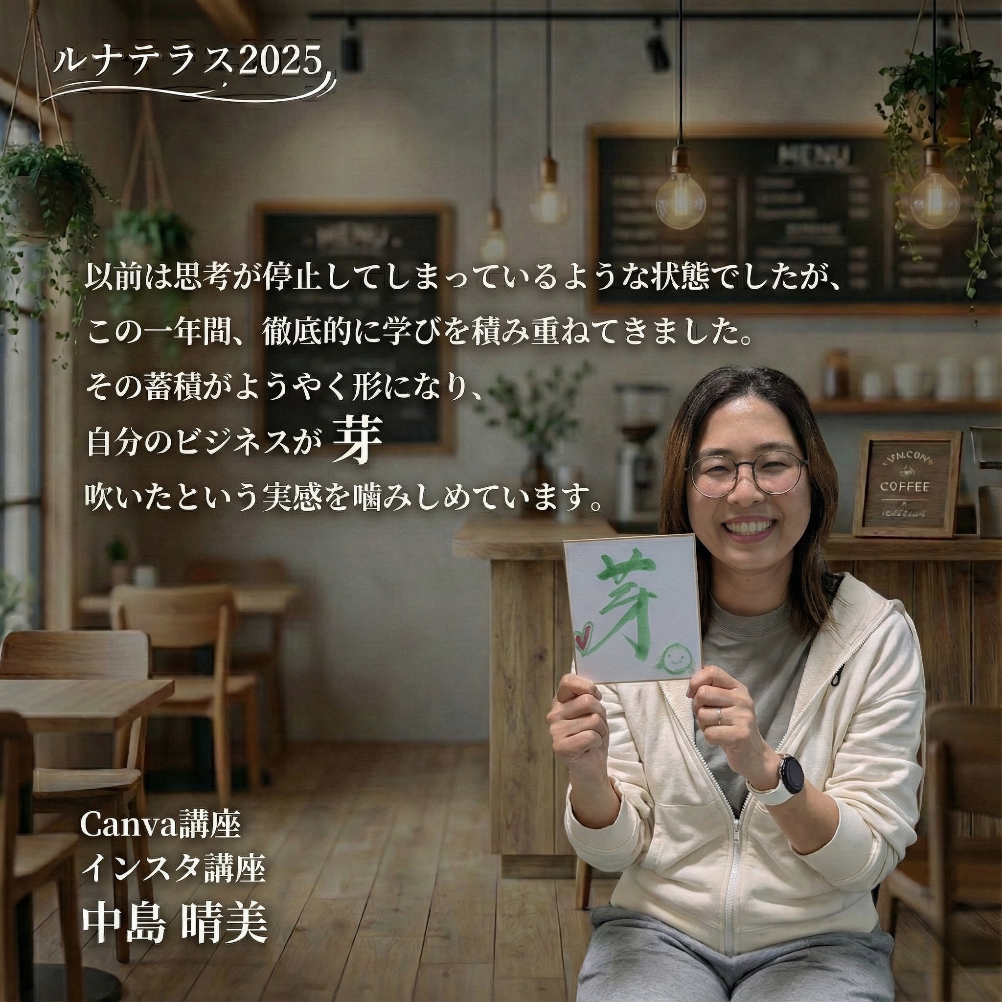 2年前は何をしていいか分からず「思考停止」していた状態から、WordPress塾やCanvaの猛勉強を経て、ようやくビジネスの 「芽」 が出た一年でした。 「昨年まではとにかく土を耕し、栄養を与えてきた(蓄積してきた)時期だった」と語り、今年はオンラインの生徒数が30名を超えるなど、具体的な成果として形になり始めた喜びを表現。来年は、この出たばかりの芽を大きく花咲かせる決意を語りました。
