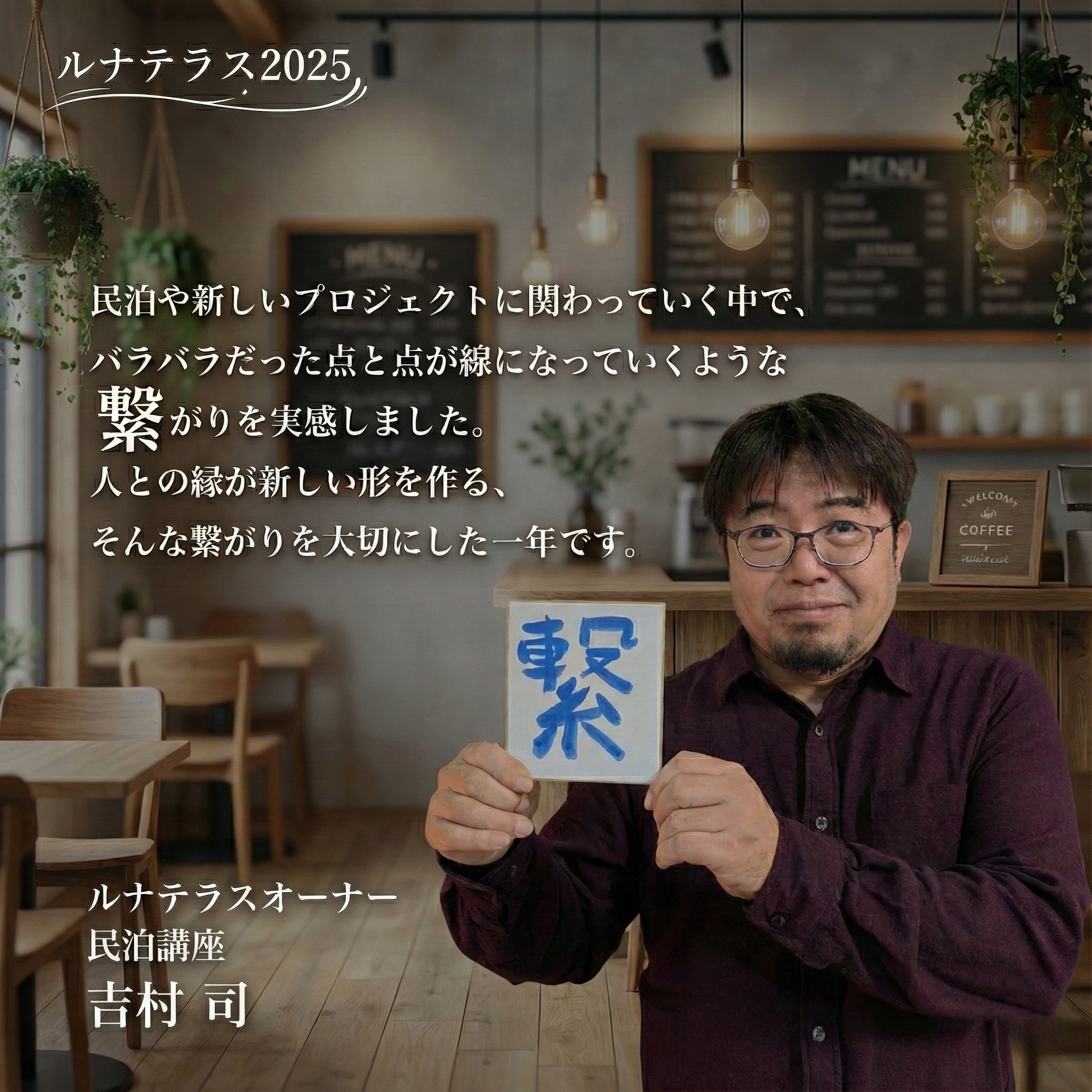 ルナテラスという場所を拠点に、講師陣や塾生、そして新しく始めた民泊ビジネスなど、多方面での 「繋」 がりを感じた一年でした。 現在、ルナテラスメンバーは15名ほどに増え、講師も10名ほどが在籍しています。一人でビジネスをするのではなく、多くの人と繋がりを持ちながら進めていくスタイルを強調。「おかげさまで、繋がりをベースに仕事をさせてもらっている」と、コミュニティの持つ力を再認識したストーリーを共有しました。