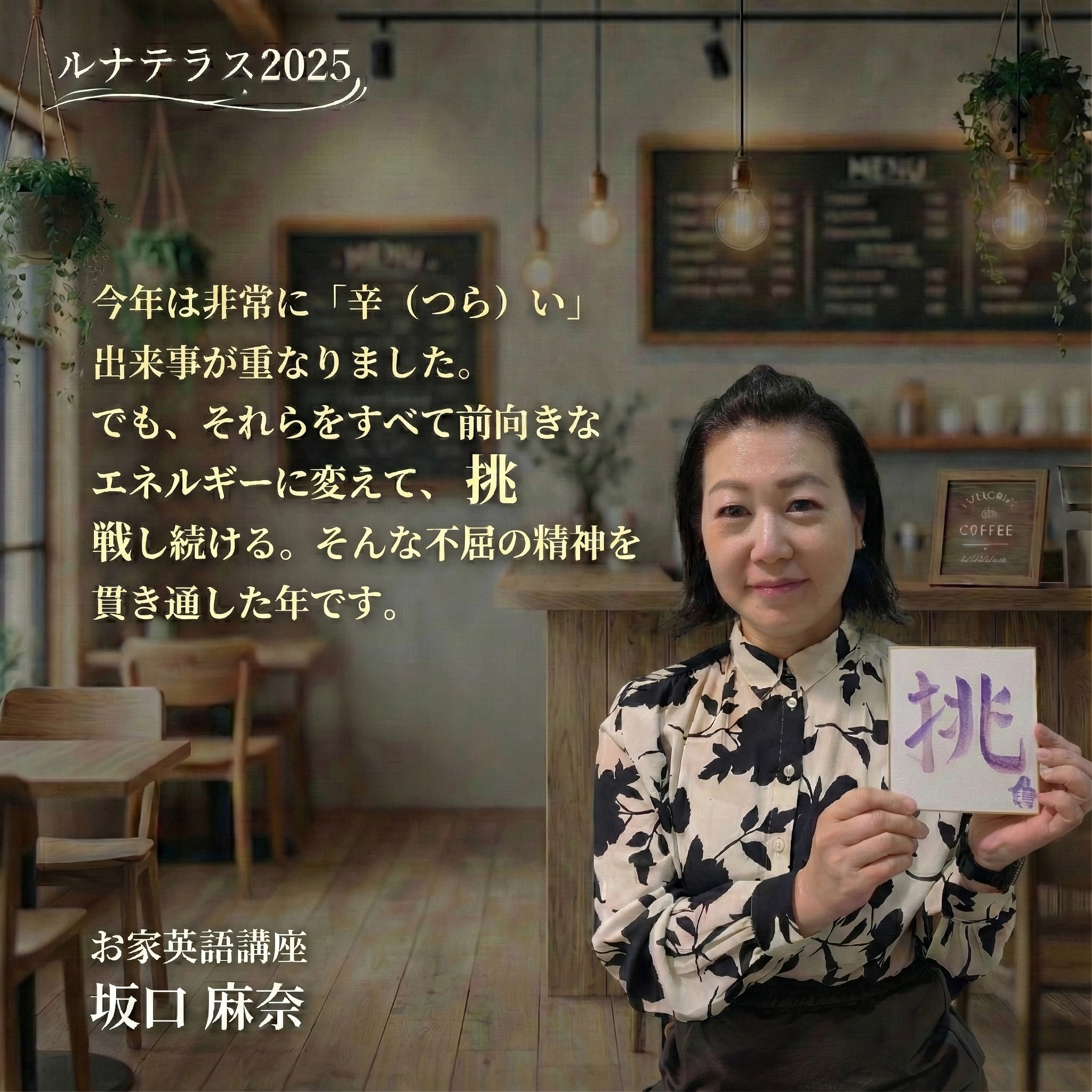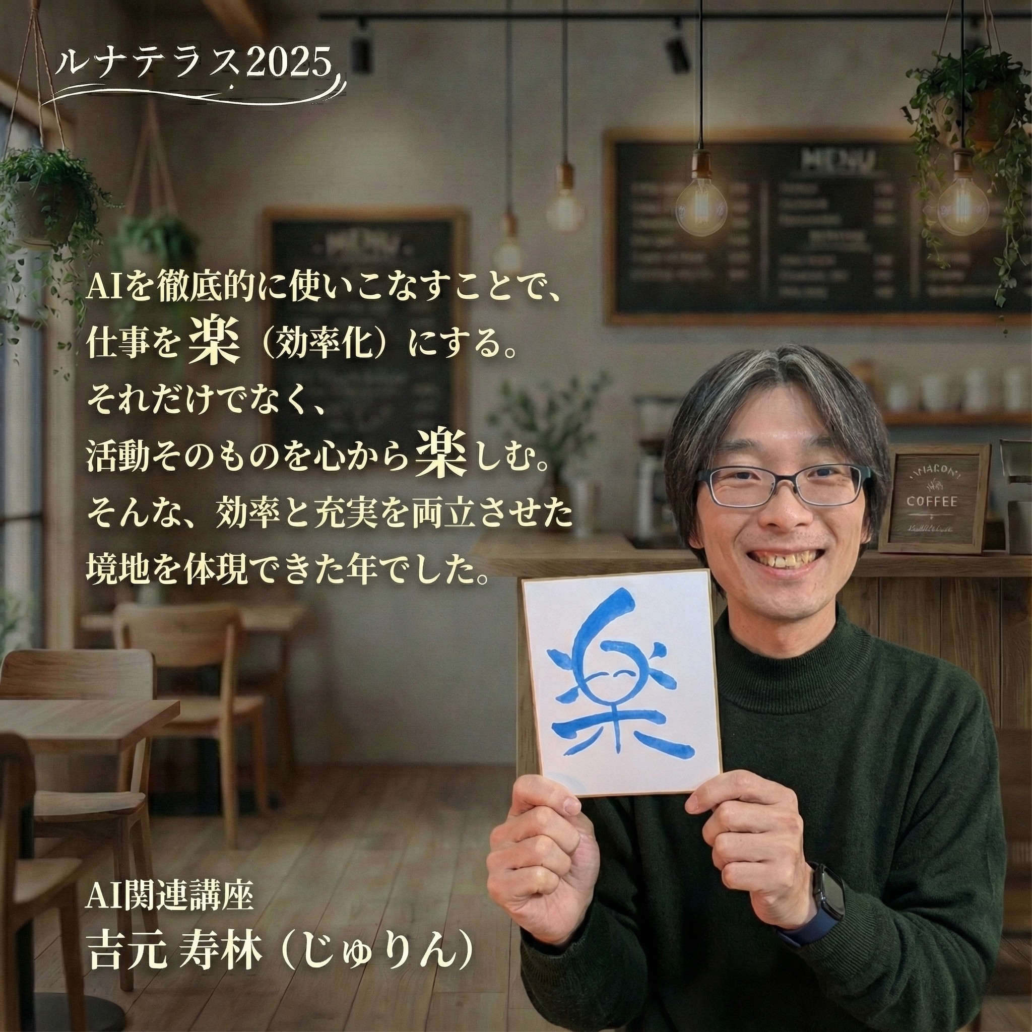 この漢字には「仕事が 楽(らく) になった」ことと「活動が 楽(たの)しい」ことの二つの意味が込められています。 特に生成AIツールの進化により、事務作業やコンテンツ作成の負担が劇的に軽減され、自分自身のゆとりが生まれました。その余白ができたことで、オンラインだけでなくルナテラスでの対面講座など、人とのリアルな交流を心から楽しめるようになったという、技術と感情がリンクした一年を振り返りました。