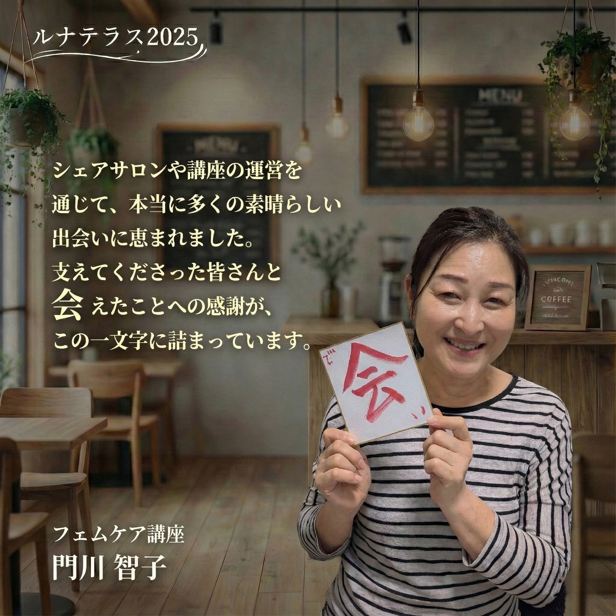 シェアサロンの運営やフェムケア講座を通じ、数えきれないほどの素晴らしい 「会」(出会い)に恵まれた年でした。 最初は一人の紹介から始まり、そこから次々とご縁が繋がって、今のサロンの形が作られていきました。「今の私があるのは、すべてこの場所での出会いのおかげ」と語り、人との直接的なコンタクトがビジネスを動かす原動力になったという感謝のストーリーを披露しました。