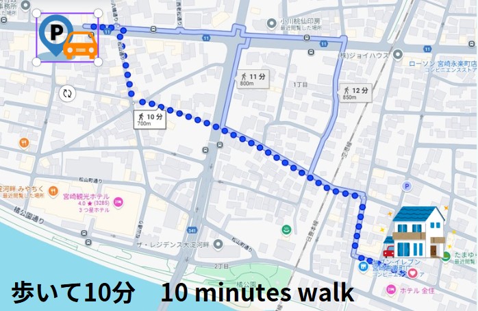 一番近い有料駐車場は、歩いて10分です。24時間500円~